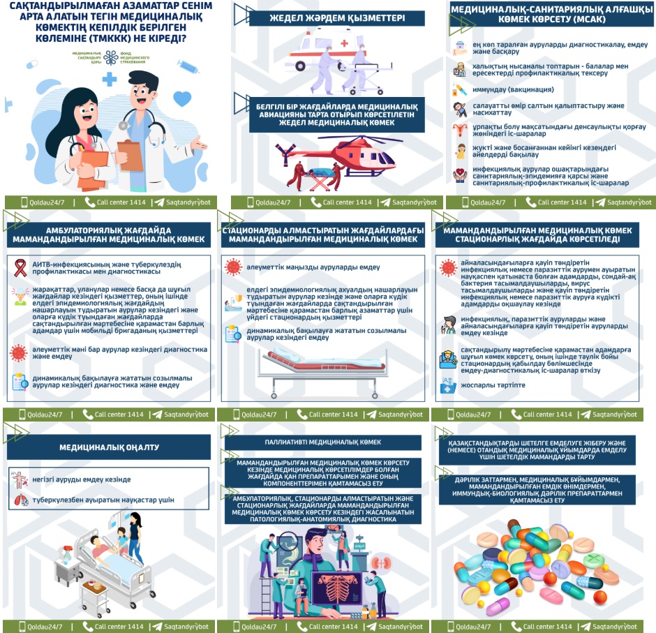 Егер сізде медициналық көмек алуға, сақтандыру мәртебесін тексеруге немесе алуға, сондай-ақ тегін медициналық көмектің кепілдік берілген көлемі шеңберінде және міндетті әлеуметтік медициналық сақтандыру жүйесінде көрсетілген медициналық қызметтерге қатысты сұрақтарыңыз болса, оларды қолда бар байланыс арналары арқылы қоя аласыз.