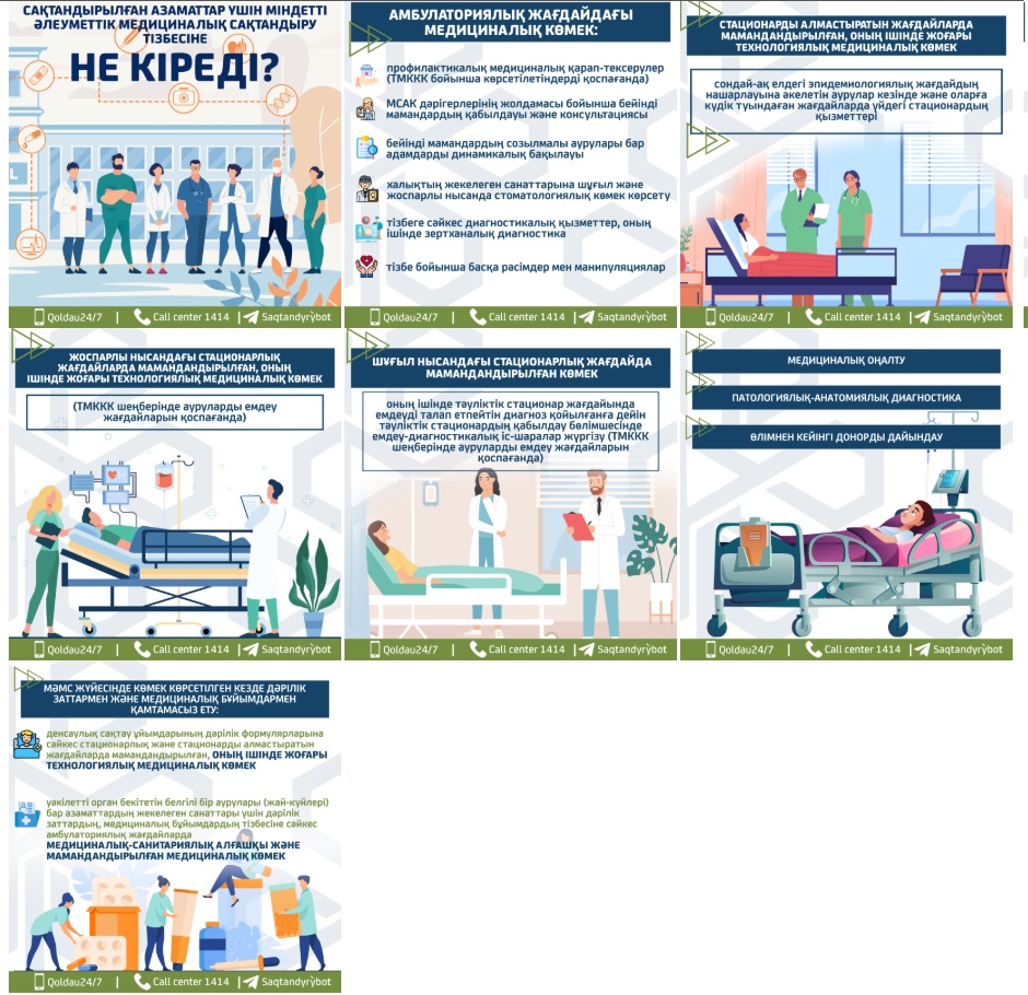 Егер сізде медициналық көмек алуға, сақтандыру мәртебесін тексеруге немесе алуға, сондай-ақ тегін медициналық көмектің кепілдік берілген көлемі шеңберінде және міндетті әлеуметтік медициналық сақтандыру жүйесінде көрсетілген медициналық қызметтерге қатысты сұрақтарыңыз болса, оларды қолда бар байланыс арналары арқылы қоя аласыз.
