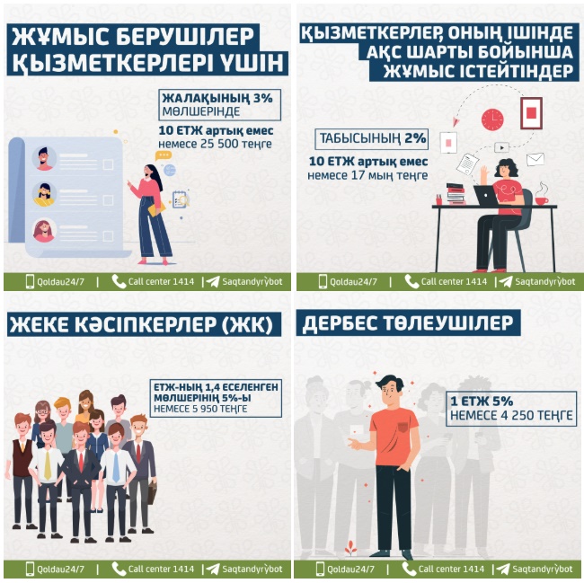 *Жұмыскерлер, соның ішінде азаматтық-құқықтық шарттар бойынша табыс алатындар – табысының 2%-ы, бірақ 10 ЕТЖ аспайтындықтан, 17 000 теңгеден артық емес.