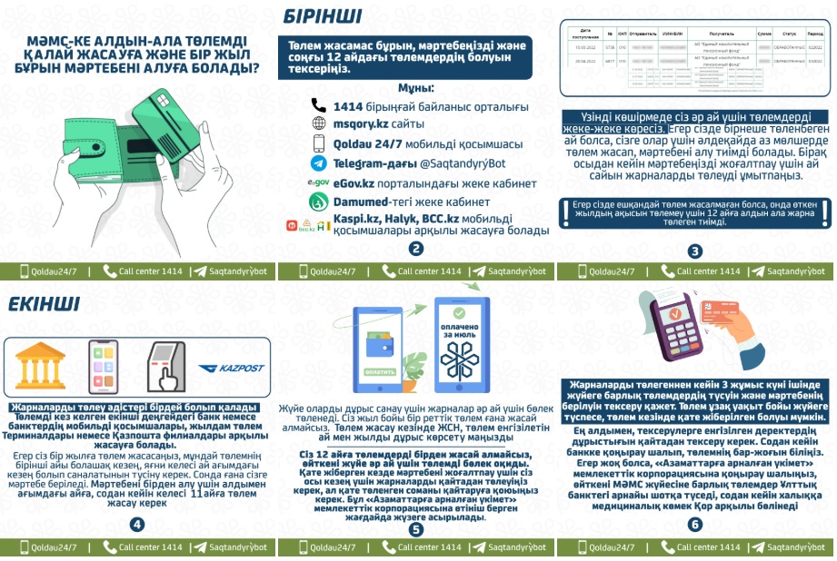 Мемлекет басшысының тапсырмасы бойынша, 2022 жылғы 5 қыркүйектен бастап «Міндетті әлеуметтік медициналық сақтандыру туралы» Заңына МӘМС жүйесіне қатысудың баламалы тәсілін көздейтін өзгерістер күшіне енді. Бұрын сақтандырылған мәртебесін алу үшін өткен 12 айға төлем жасау керек болды. Ал төлемдер болмаса, қарыз пайда болатын. Енді мәртебені алдағы 12 айға жарна төлеу арқылы алуға болады, яғни өткен жылғы қарызды өтеудің қажеті жоқ. Бір жыл бұрын сақтандырылу үшін әр айға 4 250 теңгеден жарна төлеу қажет. Ескеретін жайт, 12 айды жеке жеке төлеу маңызды. Өйткені жарналарды бір сомамен 51 000 теңге етіп төлеген кезде, жүйе жаңа тетік бойынша мәртебе бермейді. МӘМС жарналарын кез келген екінші деңгейдегі банк, банктердің мобильді қосымшалары, жылдам төлем терминалдары және "Қазпошта"филиалдары арқылы төлеуге болады.